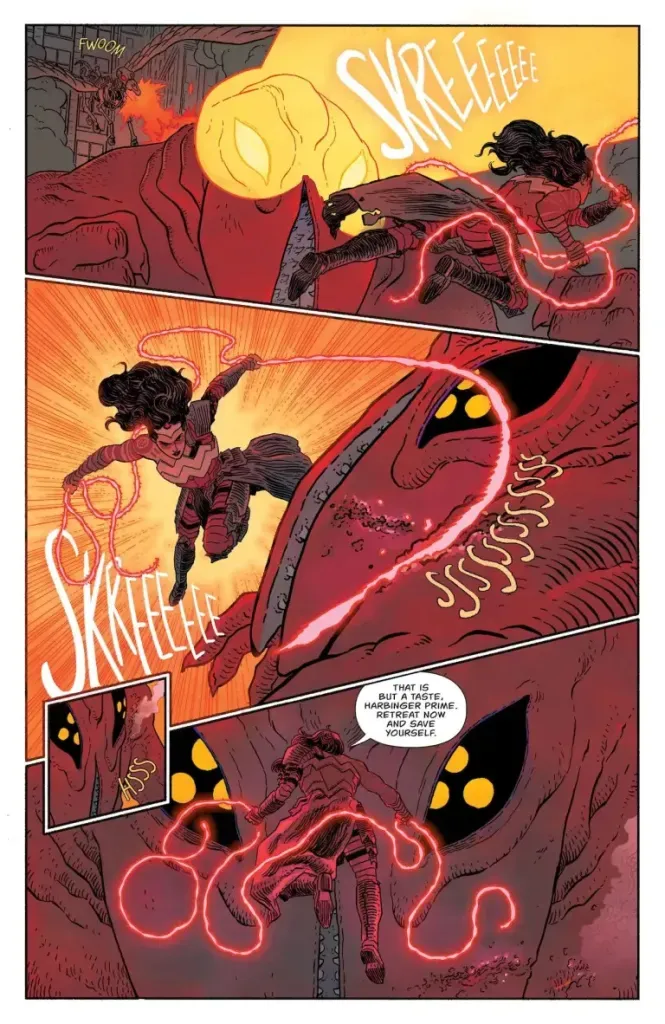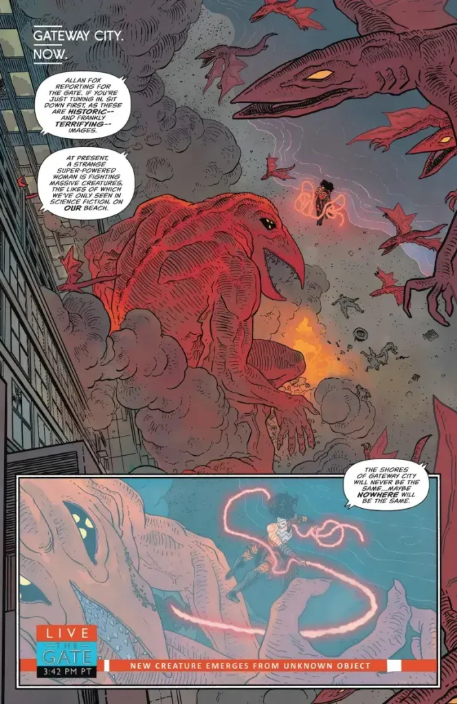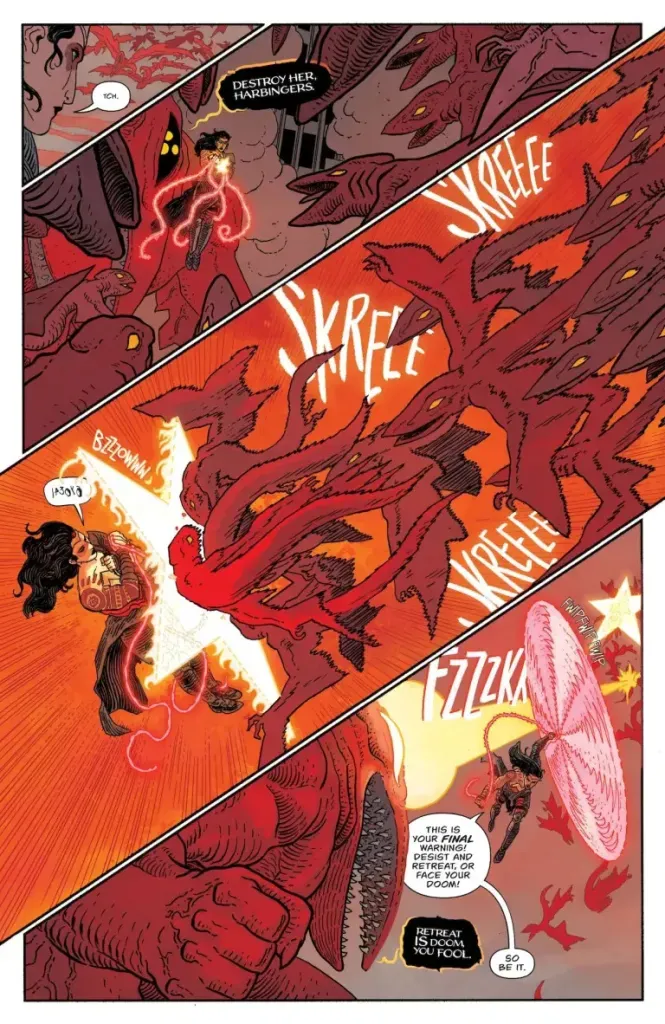 Artist Hayden Sherman and colorist Jordie Bellaire deserve massive credit for bringing this issue to life. Every page is visually breathtaking, from the larger-than-life kaiju battles to the intimate, eerie moments in hell. The artwork is nothing less than a visual feast.